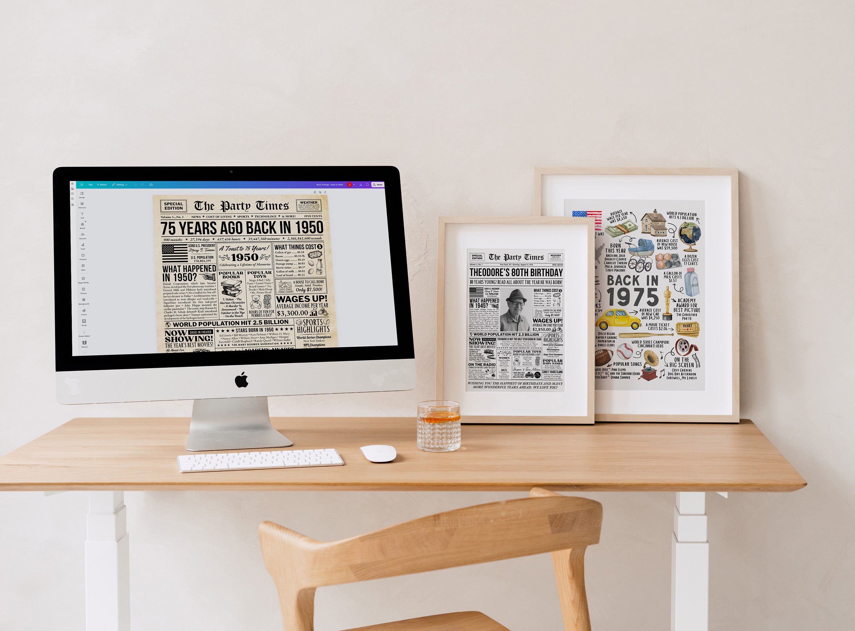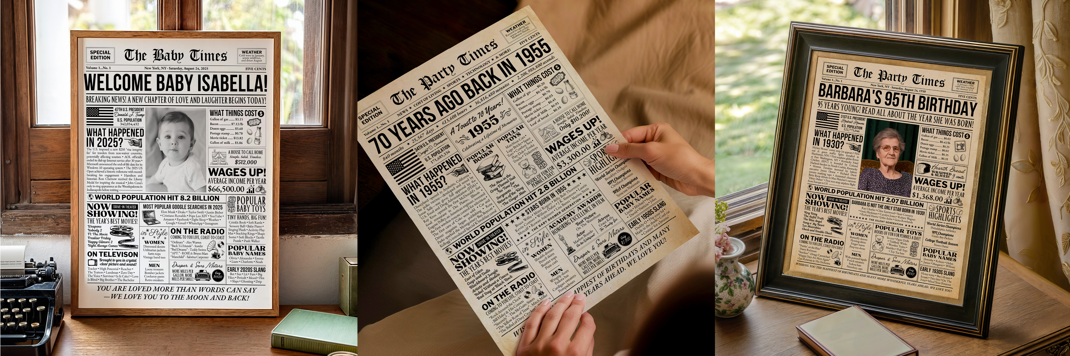 Nostalgic, editable newspaper templates that transform birthdays, retirements, and anniversaries into timeless keepsakes.