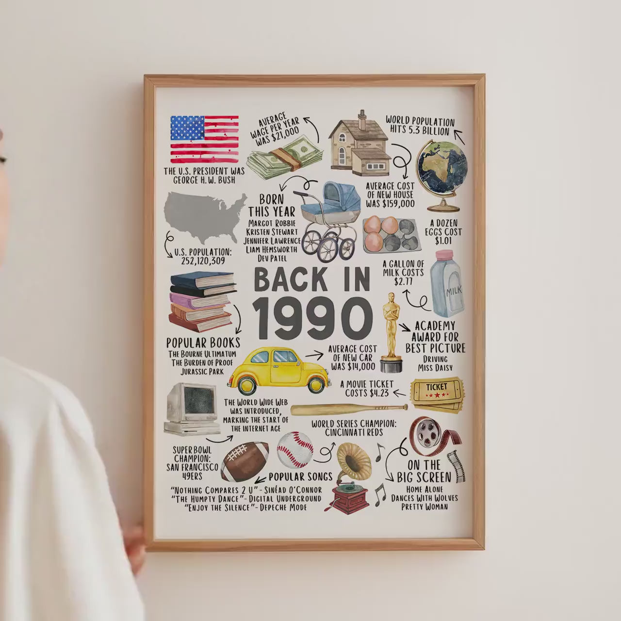 Celebrate your 35th birthday with this beautiful Back in 1990 poster! A unique print featuring fun illustrations, U.S. facts, prices, and memories from 1990 — perfect for birthday parties, gifts, or nostalgic home décor.