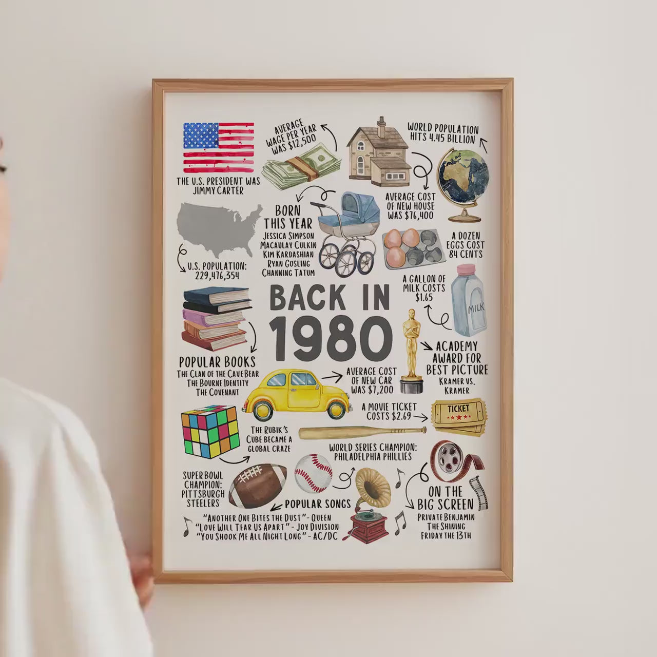 Celebrate your 45th birthday with this beautiful Back in 1980 poster! A unique print featuring fun illustrations, U.S. facts, prices, and memories from 1945 — perfect for birthday parties, gifts, or nostalgic home décor.