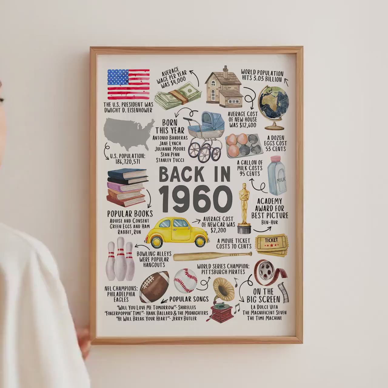 Celebrate your 65th birthday with this beautiful Back in 1960 poster! A unique print featuring fun illustrations, U.S. facts, prices, and memories from 1960 — perfect for birthday parties, gifts, or nostalgic home décor.